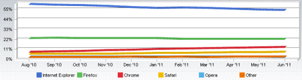 Se mantiene la tendencia de los últimos meses. Internet Explorer pierde más de medio punto, que es recogido por Chrome, que ya alcanza el 13%. Firefox está estabilizado alrededor del 21-22% y Safari rasca lentamente porcentaje situandose en un 7.5%. Resumiendo en un año IE pierde 8 puntos de los cuales casi 6 pasan a Chrome y más de 2 a Safari.