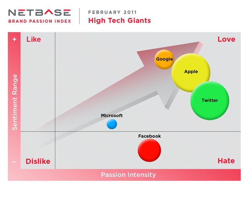 Los usuarios aman a  Apple y además hablan mucho de ella, pero son más apasionados en su relación con Twitter. Sin embargo en general no les gusta Facebook aunque hablan bastante de esta compañía (los analistas lo explican por los problemas de privacidad que genera esta herramienta utilizada por más de 500 millones de usuarios en el mundo…)